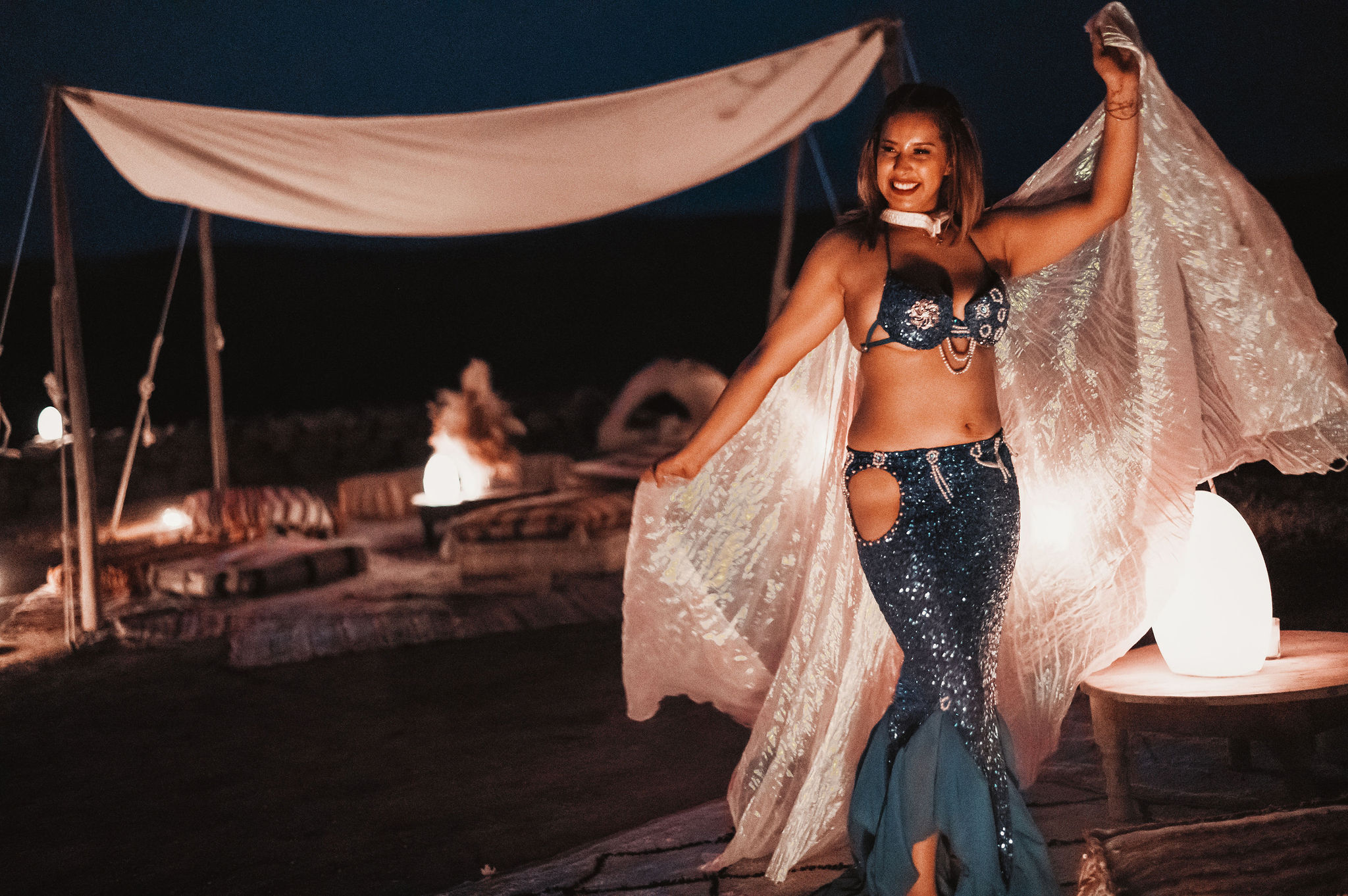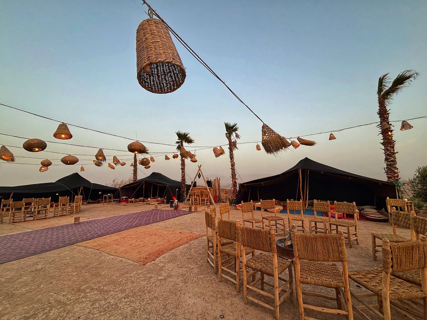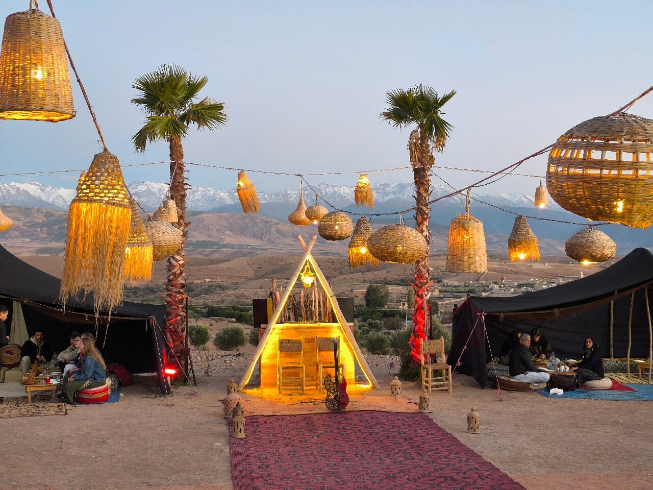 Experience a magical dinner show in the Agafay Desert, just 45 minutes from Marrakech, where the elegance of Moroccan tradition meets the beauty of the desert. Begin your evening with a warm welcome and Moroccan tea at the bivouac, then admire the sunset over the Atlas Mountains before enjoying a refined three-course Moroccan dinner under a Berber tent or on a starlit terrace. The night continues with live entertainment, including belly dancers, Gnawa musicians, fire shows, and drum performances, all complemented by a cozy lounge area with campfires and deckchairs. Optional private transfers ensure a seamless experience, with pick-up from your hotel in modern, air-conditioned 4×4 or SUV vehicles and return after the show. Perfect for couples, families, or groups, this Agafay Desert dinner show offers a unique, authentic Moroccan evening, ideal for celebrating special occasions or simply enjoying an unforgettable night under the stars.