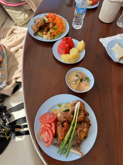 Snorkel, fish, paddleboard, or simply relax on deck while enjoying a Thai buffet, fresh fruits, and refreshing drinks. 🌅