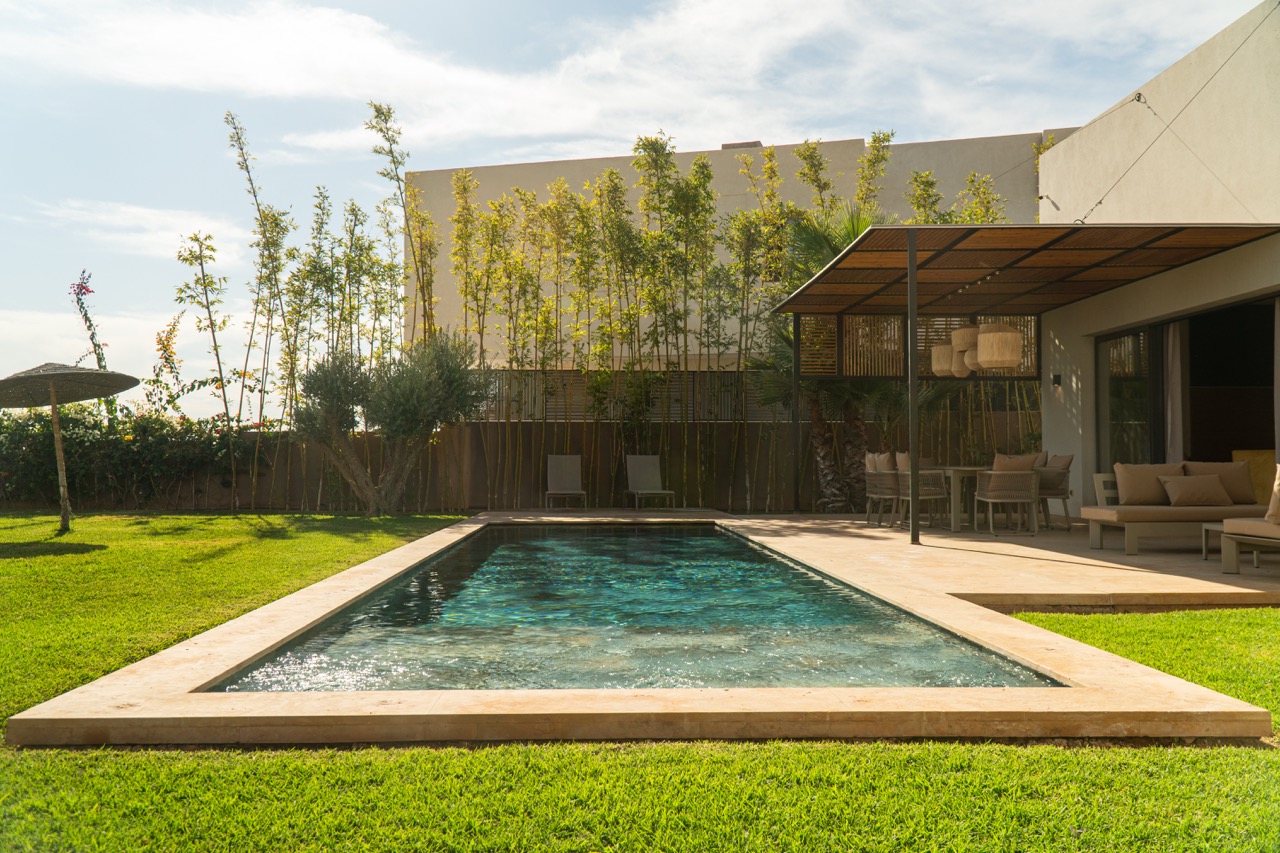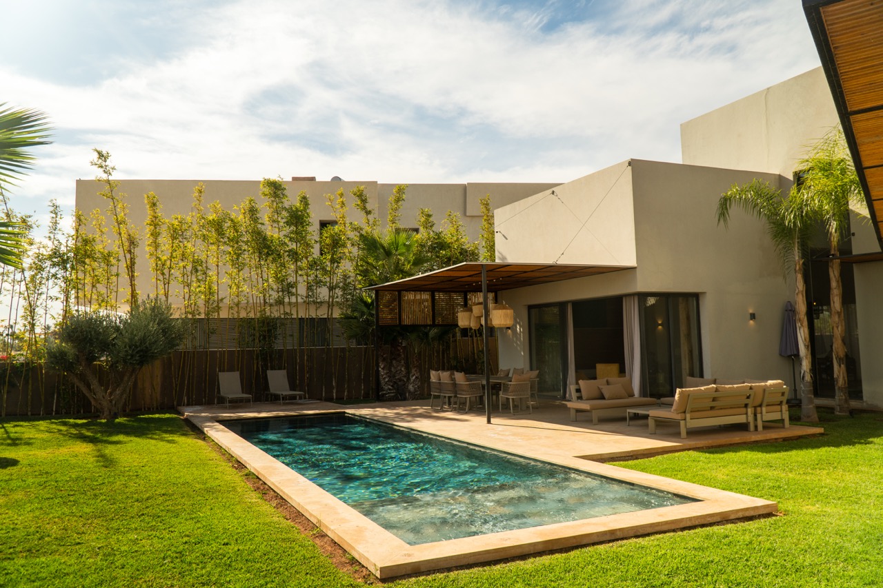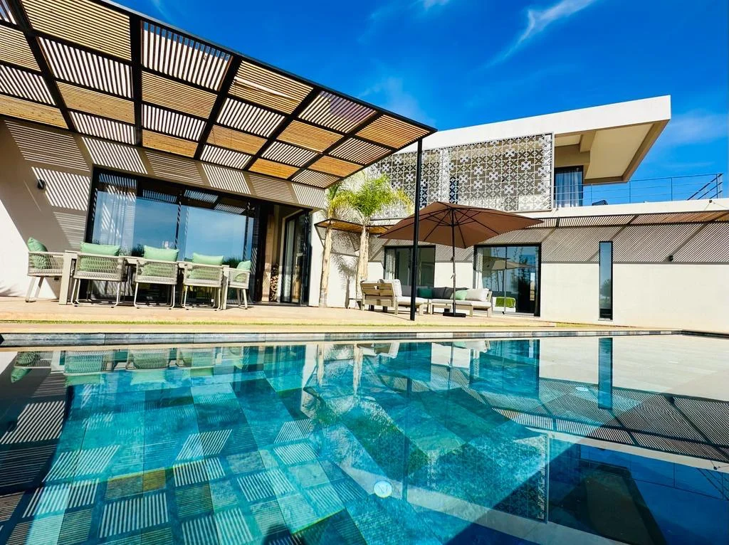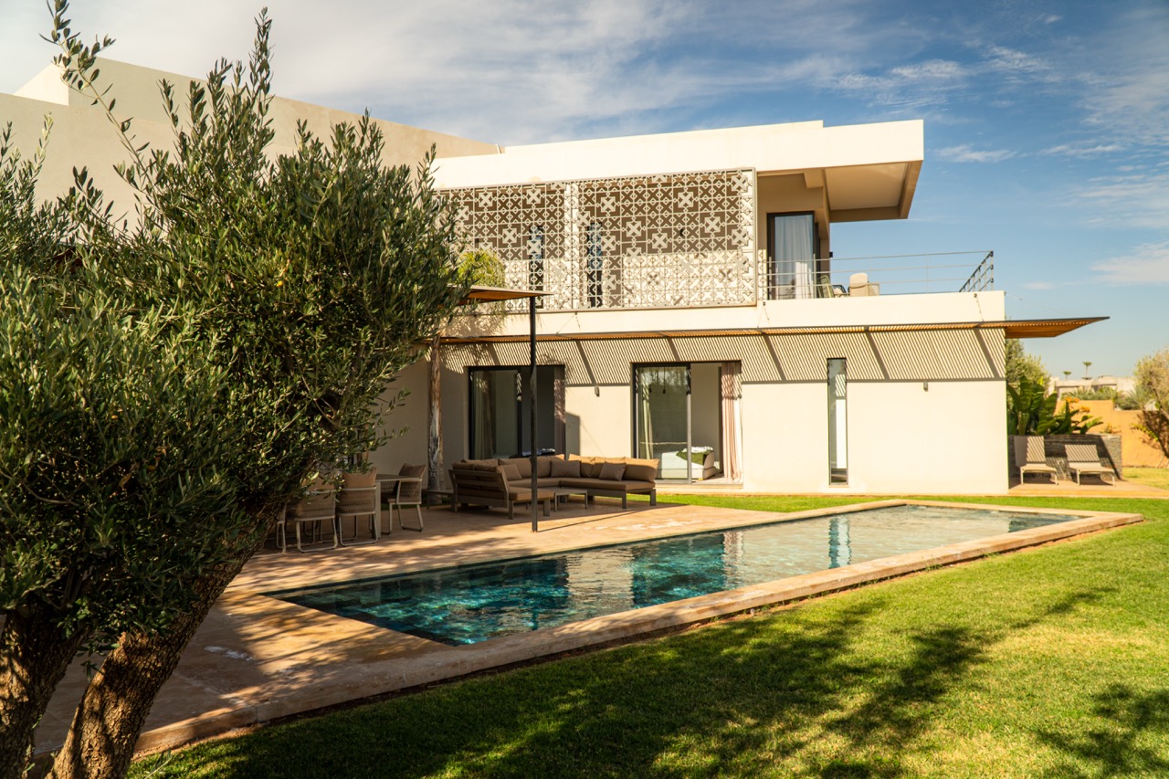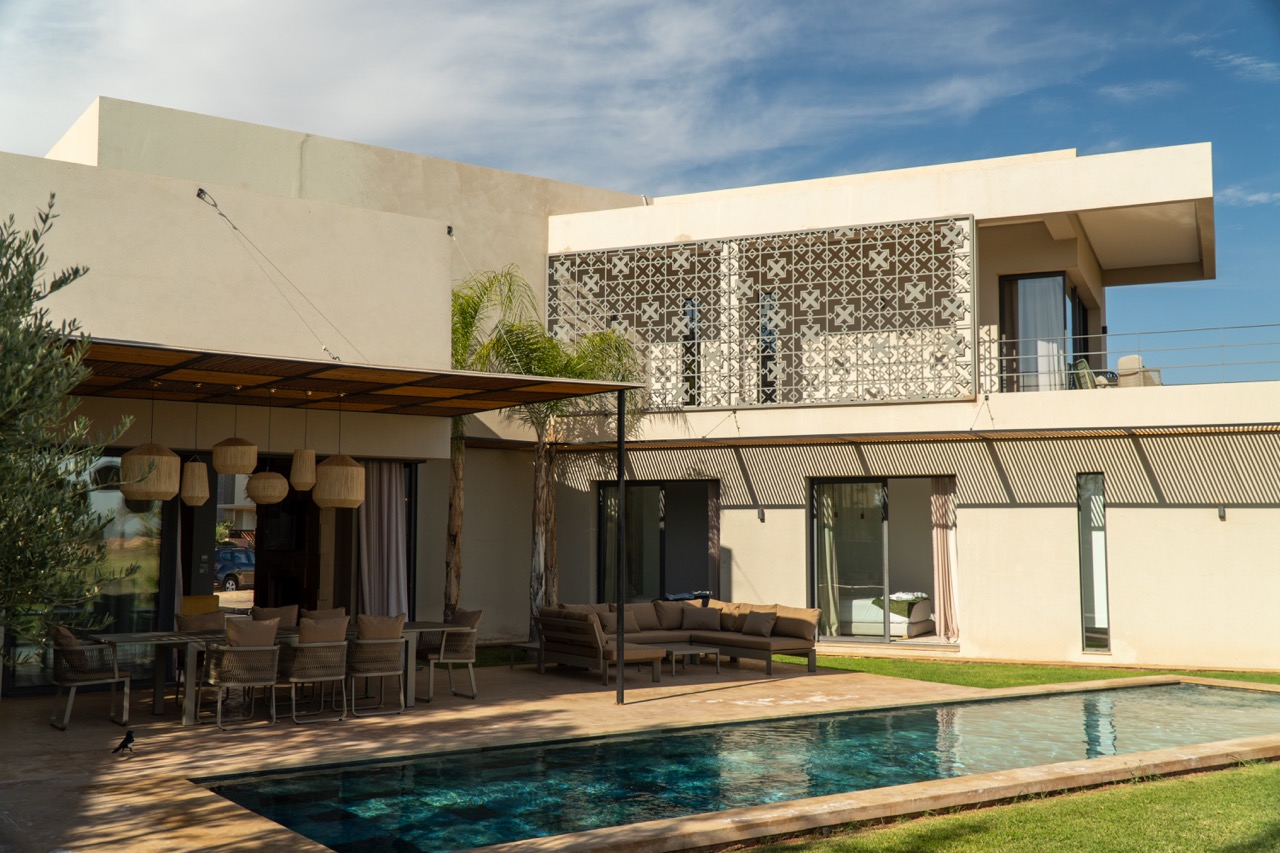 The villa features 5 elegant double bedrooms, each with a private en-suite bathroom, spacious living areas filled with natural light, and a design that blends contemporary style with subtle Moroccan touches.