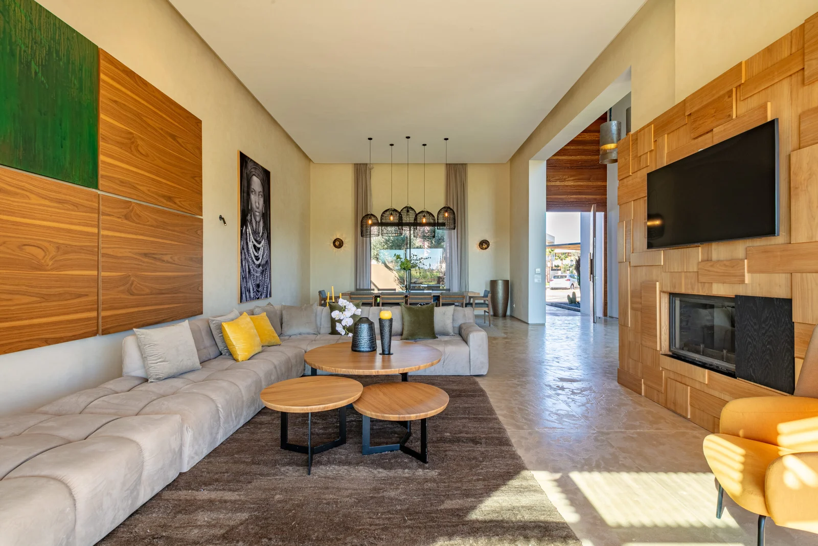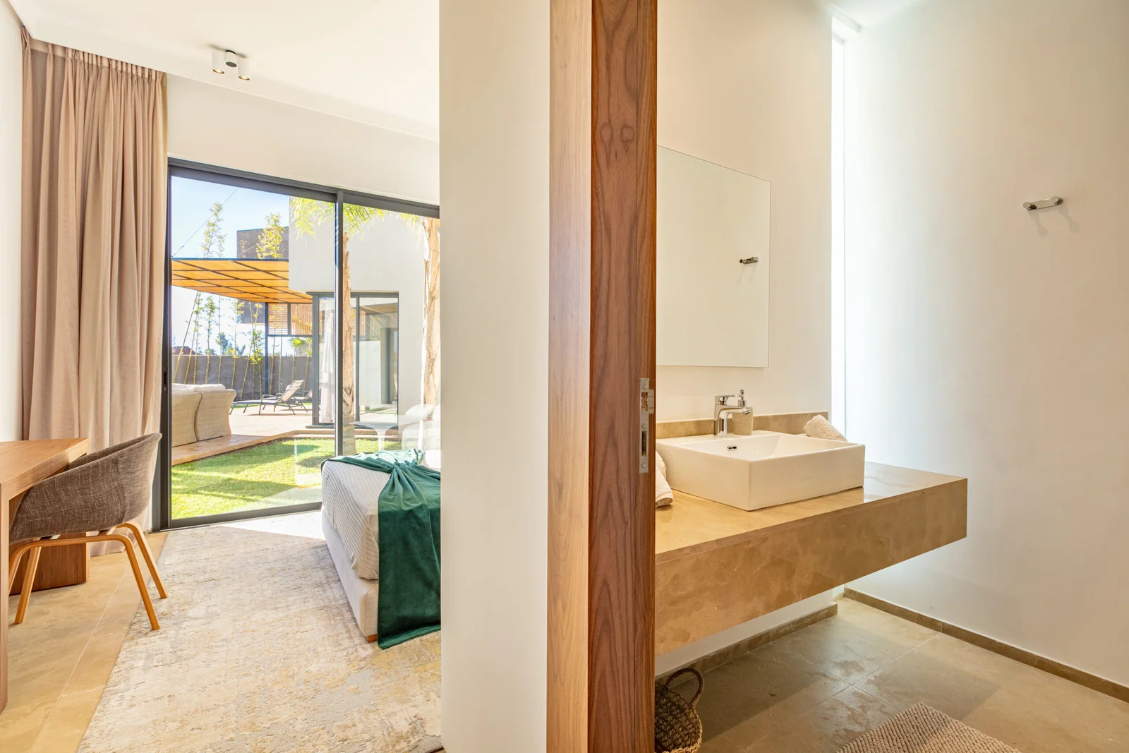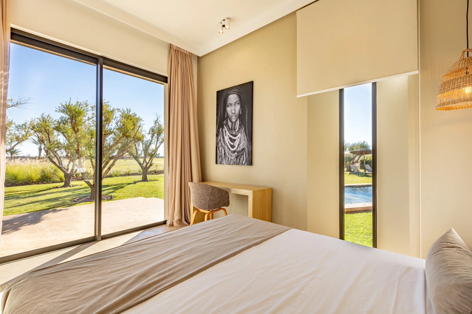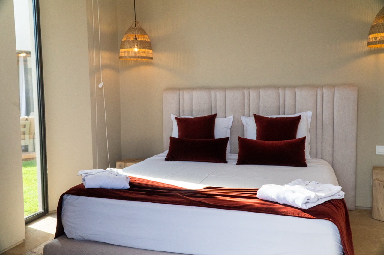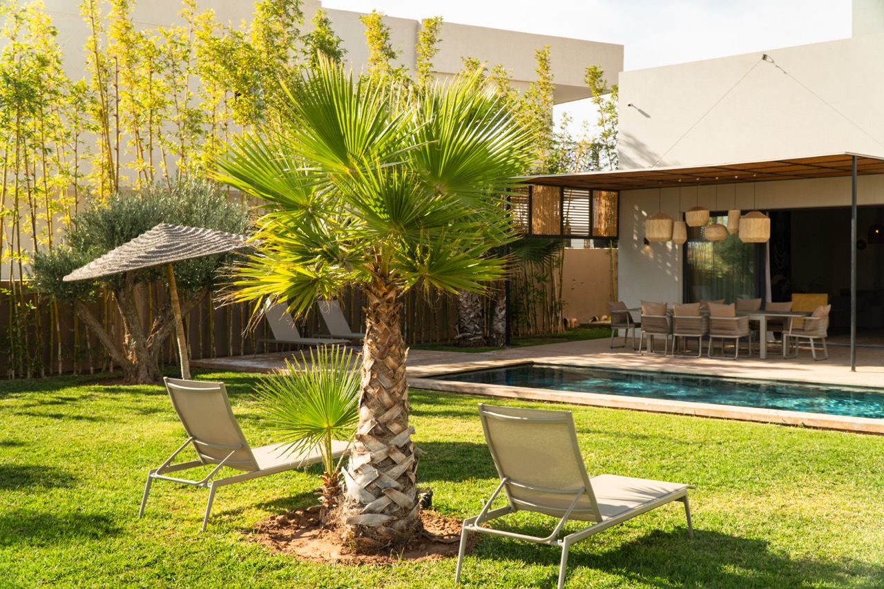 The villa features 5 elegant double bedrooms, each with a private en-suite bathroom, spacious living areas filled with natural light, and a design that blends contemporary style with subtle Moroccan touches.