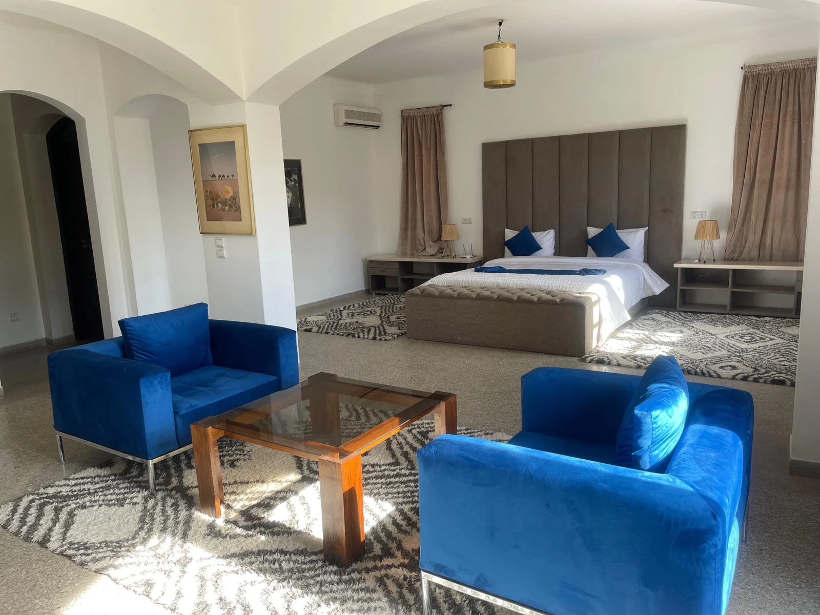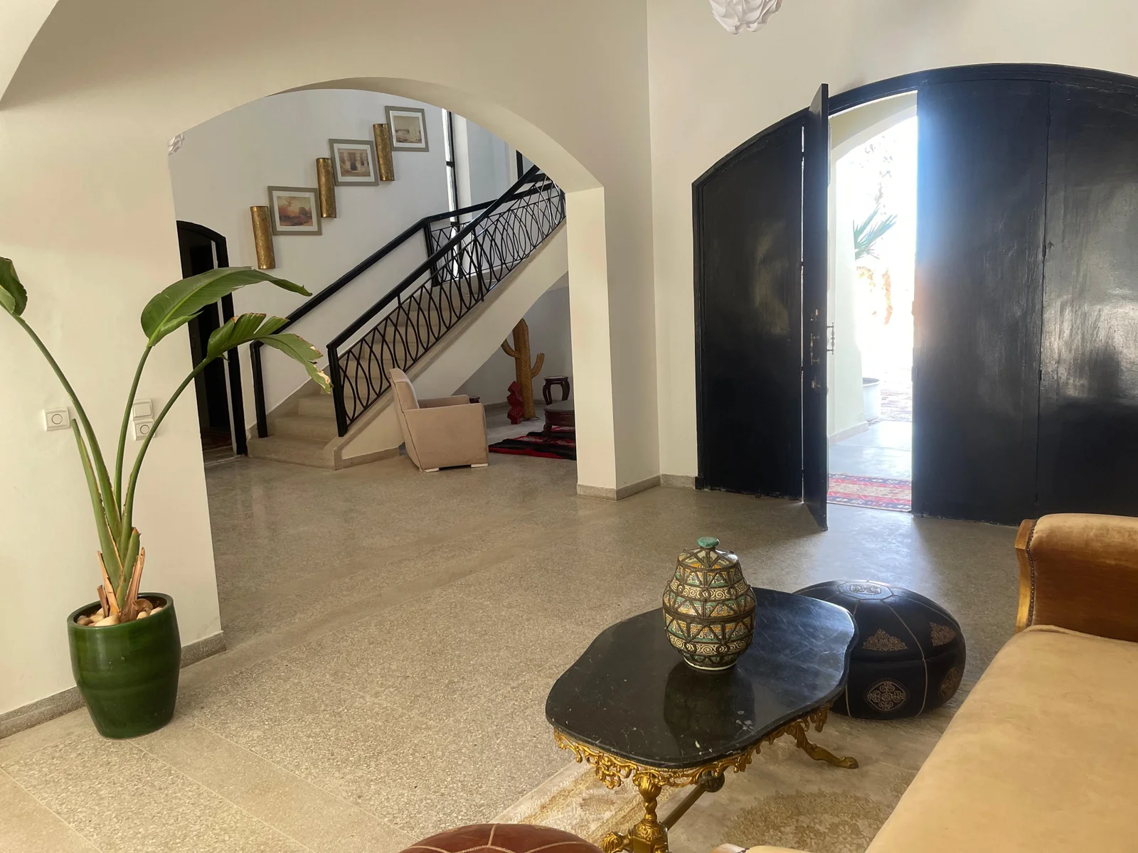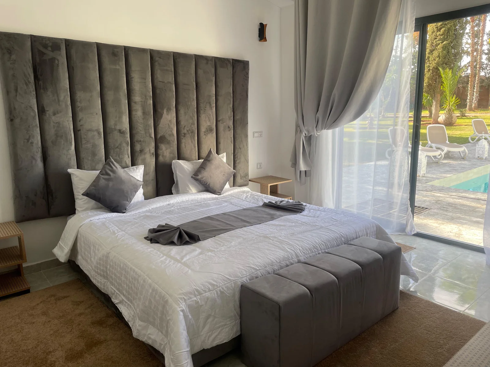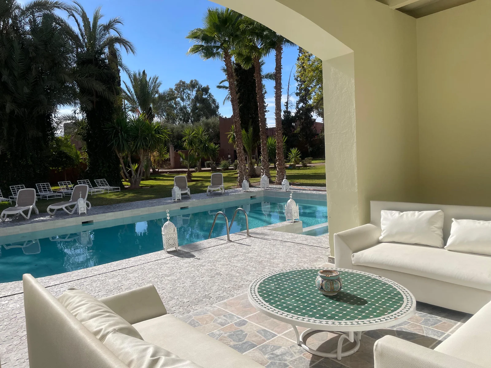 The villa features nine refined suites, each with a private en-suite bathroom, combining modern comfort with traditional Moroccan design. Bright and spacious living areas open onto the garden, creating a warm and inviting setting ideal for families or groups of friends.